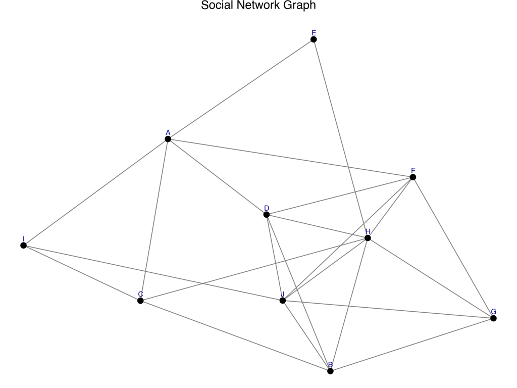 Each node represents a person (labeled A–J), and edges represent connections between them.